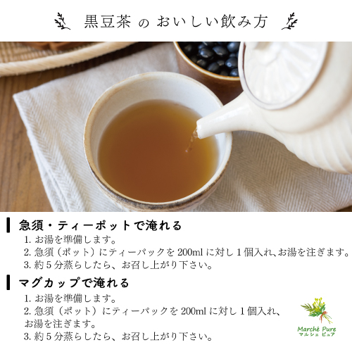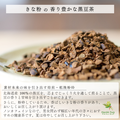 北海道産の黒大豆のみを使用した国産黒豆茶。しっかり焙煎して粉砕加工しているため、きな粉の香りがするおいしいお茶に仕上がりました。嬉しいノンカフェインで、手軽に飲めるティーバッグ。