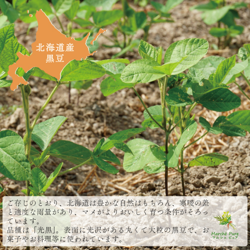 品種は「光黒」。表面に光沢がある丸くて大粒の黒豆で、お菓子やお料理など多岐にわたりに使われています。