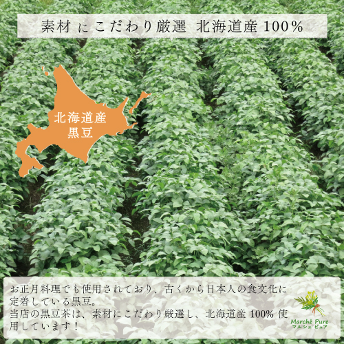 当店の黒豆茶は北海道産100%使用しています!ご存じのとおり、北海道は豊かな自然はもちろん、寒暖の差と適度な雨量があり、マメがよりおいしく育つ条件がそろっています。