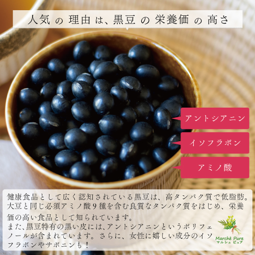 健康食品として広く認知されている黒豆は、高タンパク質で低脂肪。大豆と同じ必須アミノ酸9種を含む良質なタンパク質をはじめ、栄養価の高い食品として知られています。