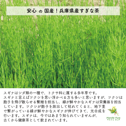 マルシェ ピュアのスギナは兵庫県産100%。国産にこだわり、さらに産地にもこだわりました。また、農薬を使っていませんので、安心してお召し上がり頂けます。